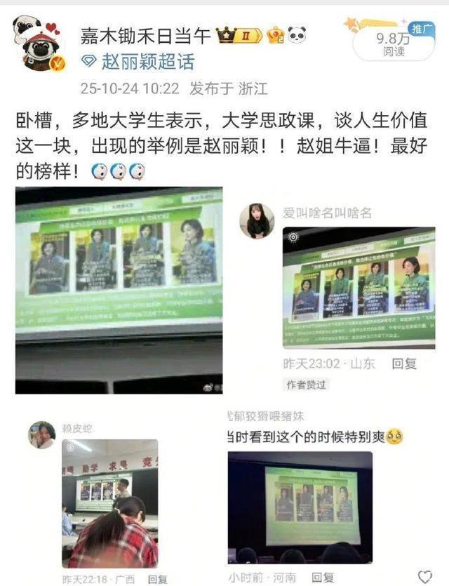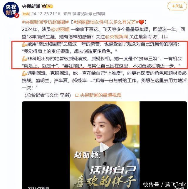 央视采访被纳入思政课件这件事特别有意思。 老师在课堂上放她的采访视频,讲的是奋斗、坚持、不放弃这些主题。 学生们看完都说很受启发。 一个演员能成为年轻人的榜样,这比任何奖项都有意义。