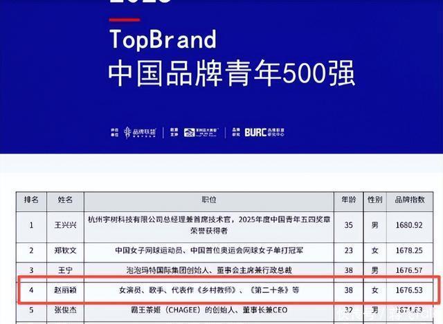 她还入选了中国品牌青年500强,排名第4。 这个榜单不是看人气,而是看社会贡献和商业价值。 一个农村出身的女演员能排到这个位置,说明她的影响力早就超越了娱乐圈。 品牌方愿意和她合作,不只是因为她红,更因为她的形象正面,作品质量有保证,不会出什么幺蛾子。